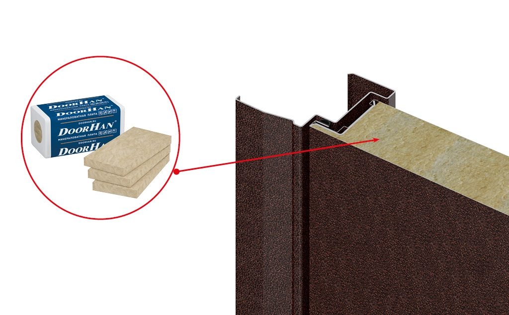 Минераловатная плита — это натуральный строительный материал, состоящий из плотно спрессованных между собой волокон. Она обладает высокими показателями тепло- и звукоизоляции, а также огнестойкости. В конструкции дверей DoorHan минераловатная плита выполняет сразу несколько функций: